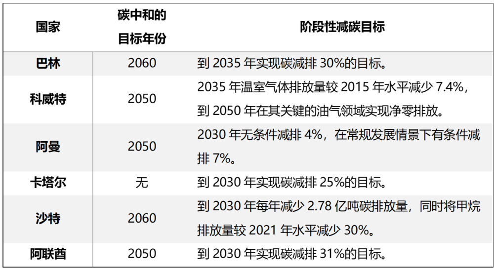 为应对上述挑战,海合会各国纷纷制定宏伟的国家发展愿景与战略规划,明确了绿色转型的方向与目标。沙特2016年提出“2030愿景”,核心是打破石油依赖、实现经济多元化;阿联酋推出“净零2050”战略,直指2050年碳中和目标。目前,除卡塔尔外,其余五国均明确2050或2060年碳中和承诺,且全部设定阶段性减排目标,深度融入全球气候治理进程(见表1)。