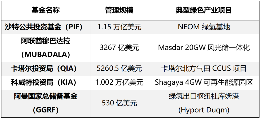 除了规划引导,海合会国家的主权财富基金也在可再生能源领域发挥着重要作用。据统计,海合会国家主权财富基金的总规模约达4.4万亿美元,相当于全球100家最大主权财富基金总资产的34%4。这些主权基金凭借雄厚的资金实力,积极投资国内外绿色产业项目,通过精准布局推动转型(见表2)。