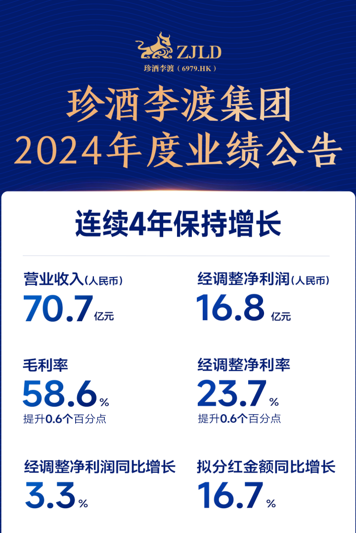 在白酒行业深度调整的2024年免息配资炒股平台,珍酒李渡集团(6979.HK)以一份“营收70.7亿元、经调整净利润16.8亿元”的答卷,实现了连续四年正增长的逆势突围。